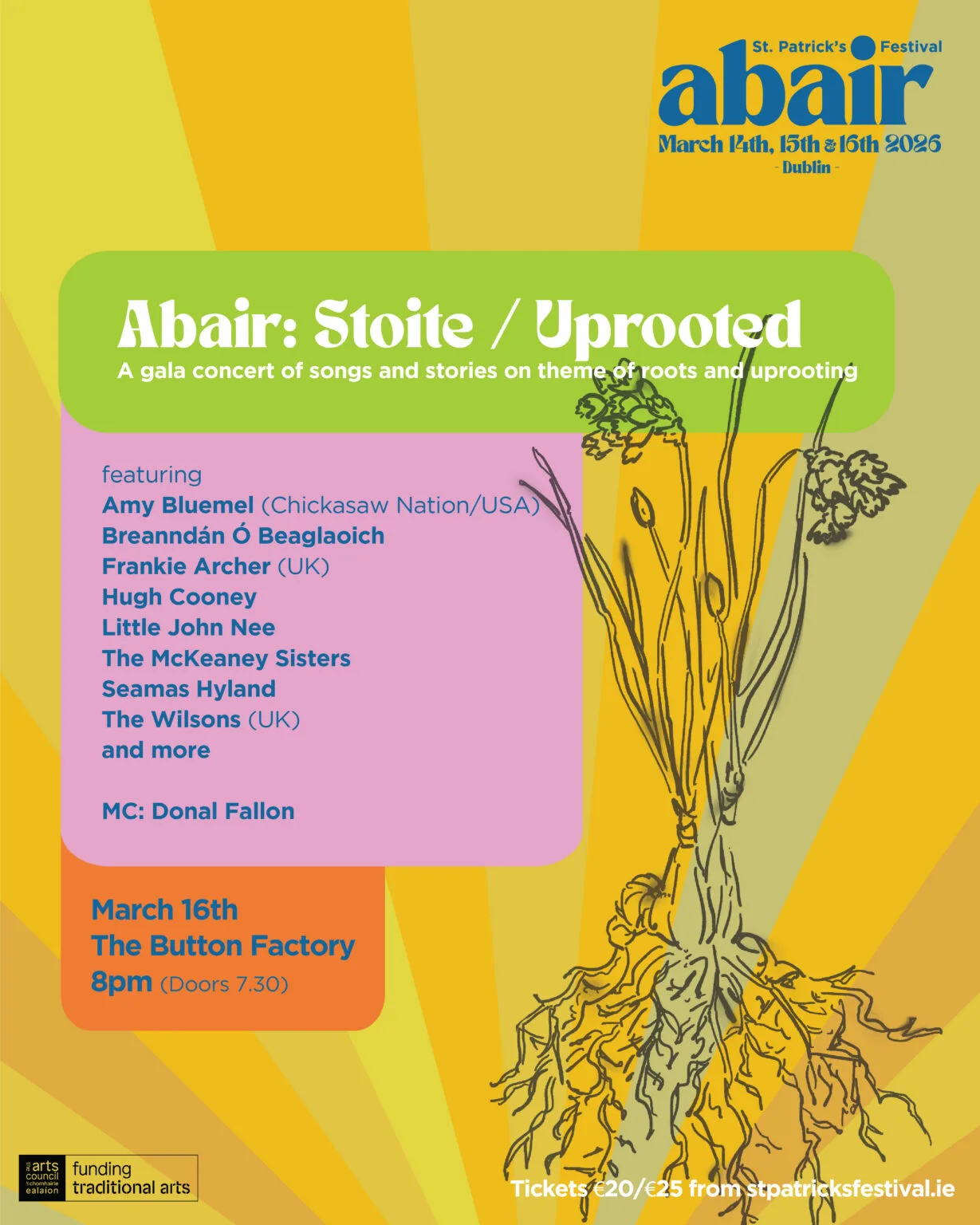 Expect some surprise guests and an inspiring night of song and tradition on the themes of roots and uprooting hosted by Donal Fallon.