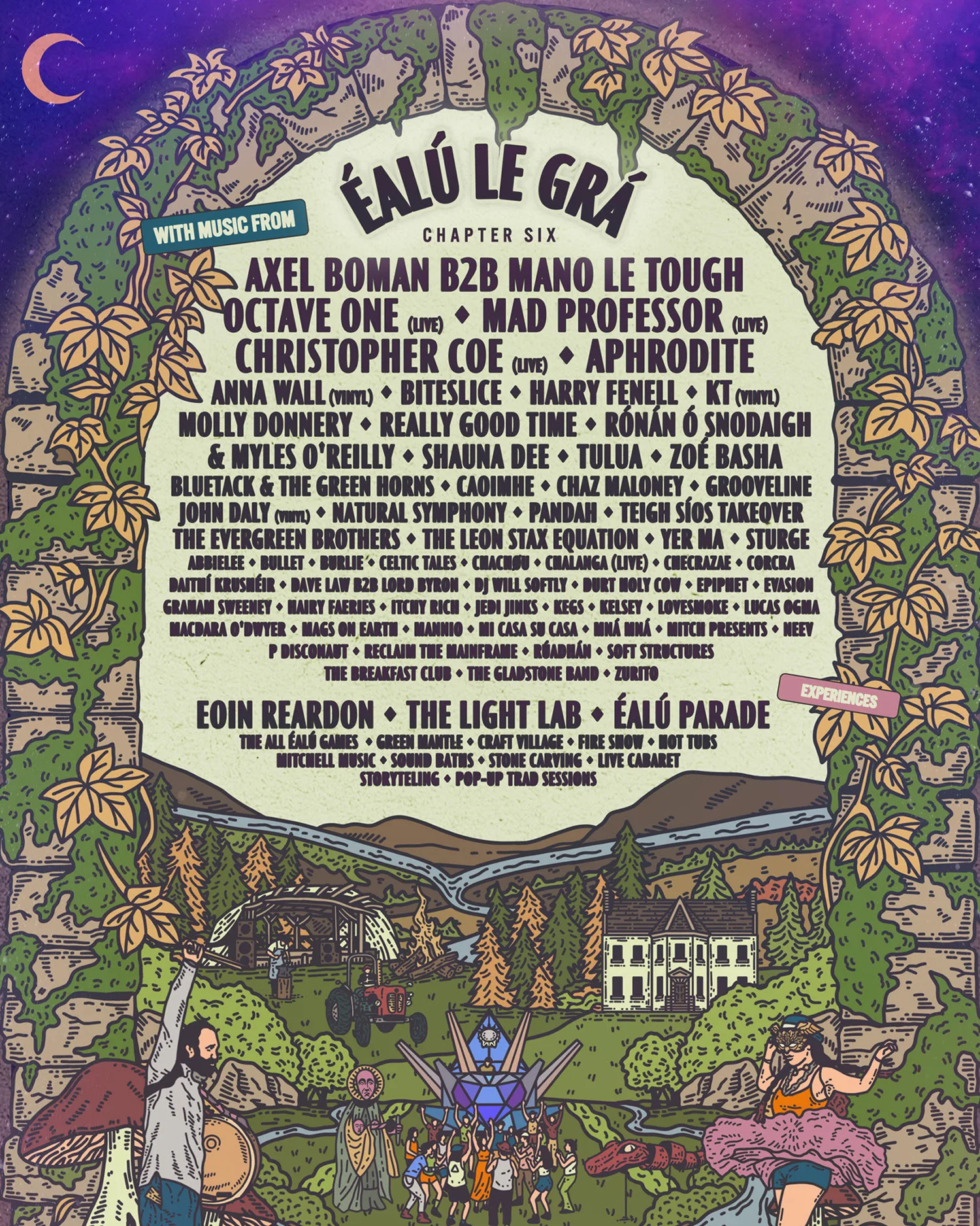 And beyond the music- the Éalú Parade, The Light Lab, The All Éalú Games, the Fashion Show, the Craft Village, fire show, hot tubs, sauna, stone carving, live cabaret, storytelling, and pop-up trad sessions are happening on site.