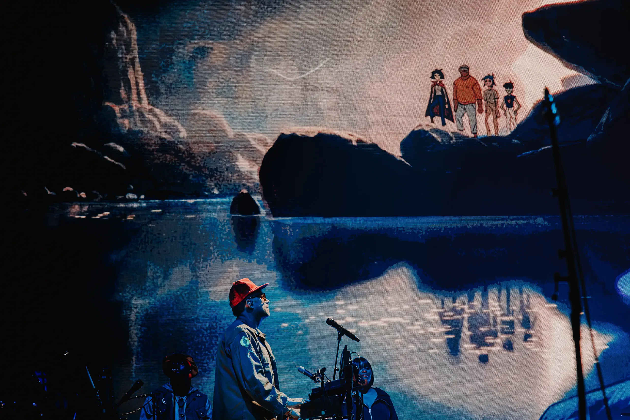 The Gorillaz live show in 2026 nails the balance of presenting the “virtual band” of 2-D, Noodle, Murdoc and Russell with a suite of other rich animations via three screens along with this robust and layered, platformed live show.