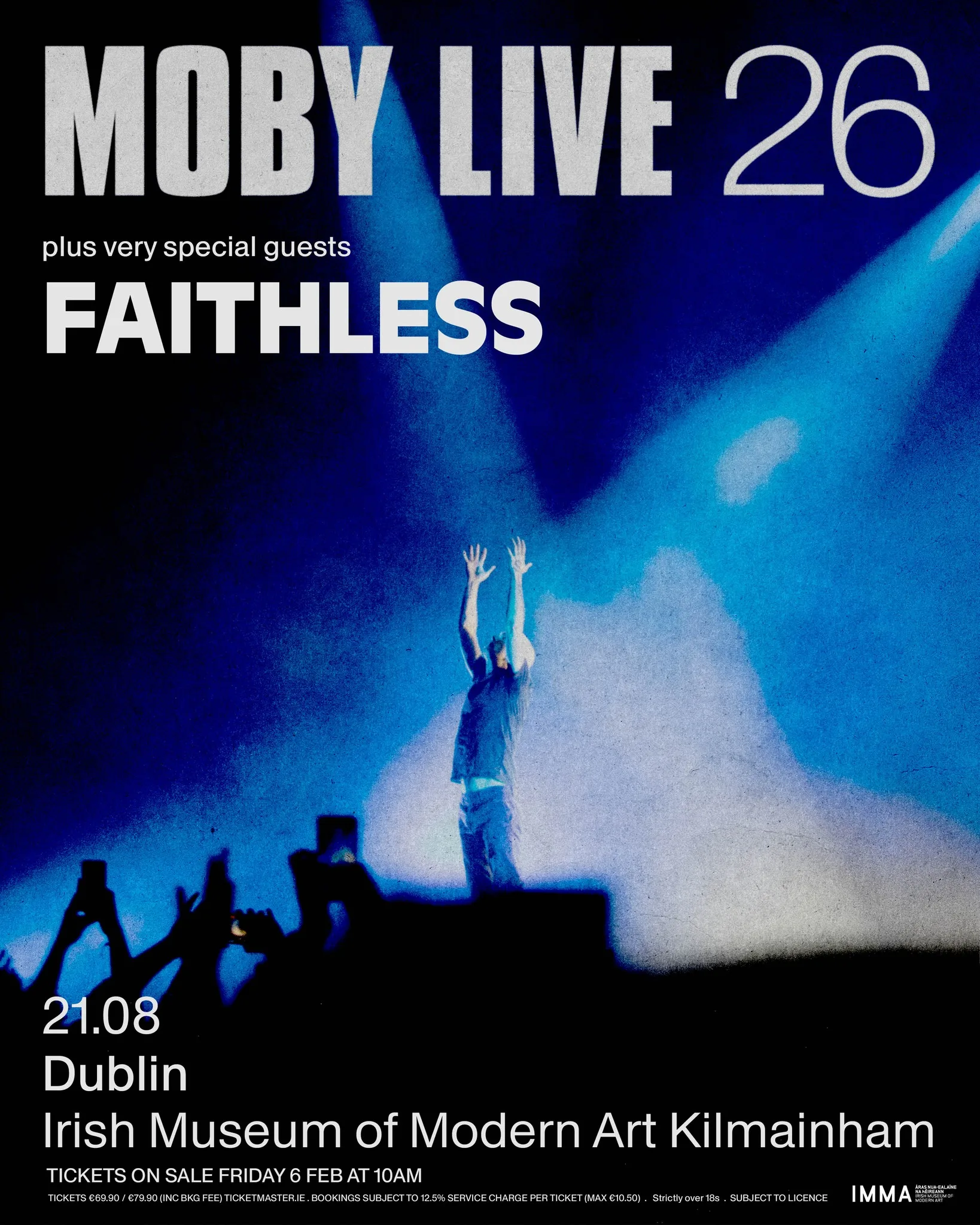 Moby as been announced for a summer gig at the Irish Museum of Modern Art, Royal Hospital Kilmainham, Dublin on Friday 21st August 2026 with support from ’90s Insomnia smash hit act Faithless.