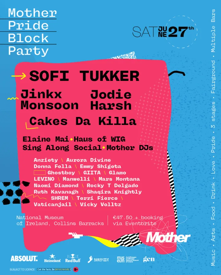 The two-day Pride experience on June 26th and 27th, Mother Pride 2026, marks the collective’s most ambitious edition to date — transforming Collins Barracks into a multi-stage celebration of LGBTQ+ culture with festival-scale production, fairground rides, bars, food vendors, and dedicated queer spaces.Expect a full-day outdoor spectacle of music, art, drag, DJs and community — the biggest Pride party in the city.