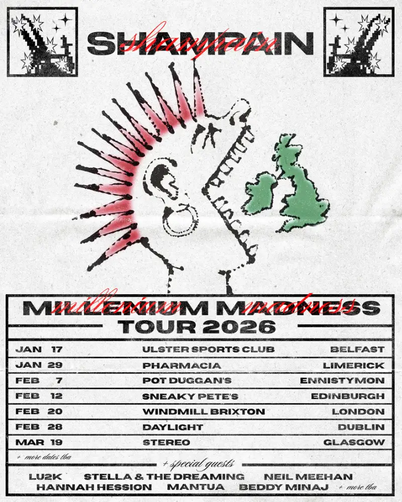 Millennium Madness is the debut album from Shampain, released in November, and the seven-date Irish and UK tour will take in some small and DIY venues in Clare, Belfast, Limerick, Dublin Glasgow, Edinburgh and London.