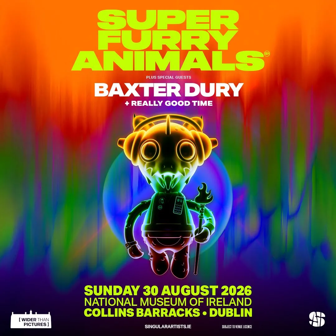 Super Furry Animals with special guests Baxter Dury and Really Good Time play the National Museum of Ireland, Collins Barracks, Dublin on Sunday, 30th of August 2026, as part of the Wider Than Pictures concert series (subject to venue licence).