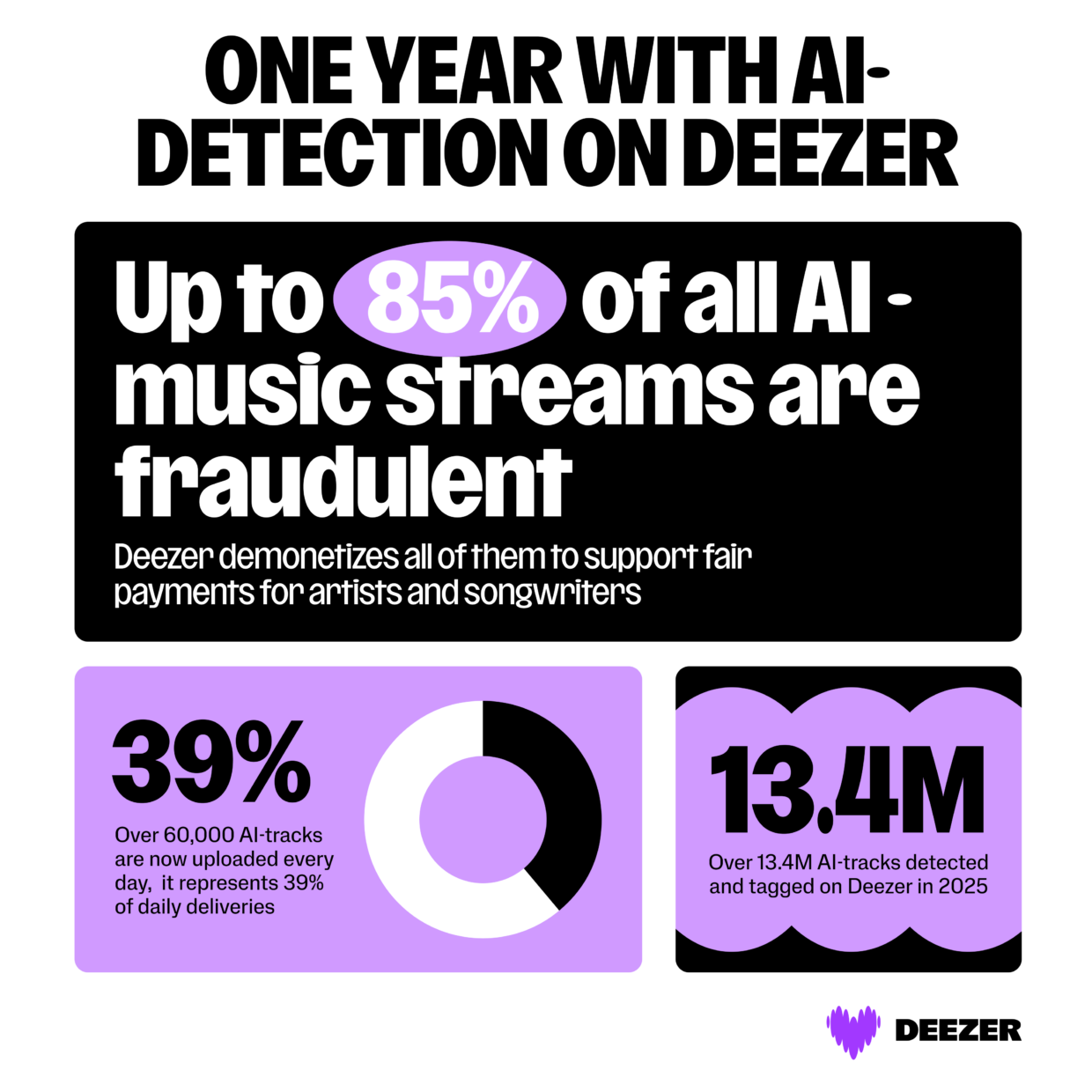 - Up to 85% of all streams on AI-generated music are detected as fraudulent – they are demonetized and removed from the royalty pool, as Deezer continues to support fair payments for artists and songwriters
